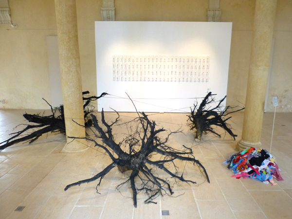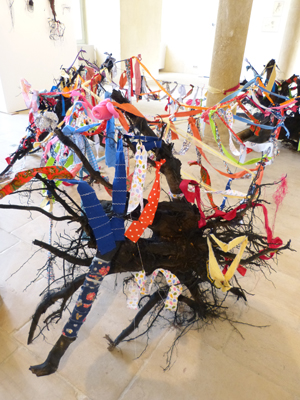 A chacun son lien est une construction textile dépendante de trois racines de peuplier, séchées et noircies, disposées et reliées par un cordage dans