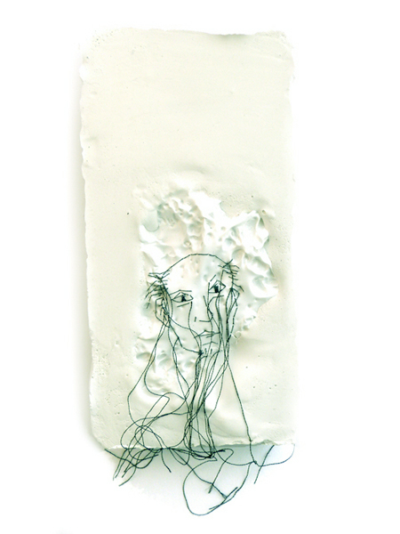 Then a fictitious face is drawn in stitch, by hand. This plastic fragment is placed in plaster cast in a mold.