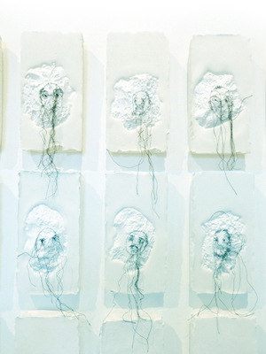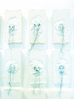 Ensuite un visage fictif est dessiné en point de couture, à la main. Ce fragment de plastique est placé dans du plâtre coulé dans un moule.