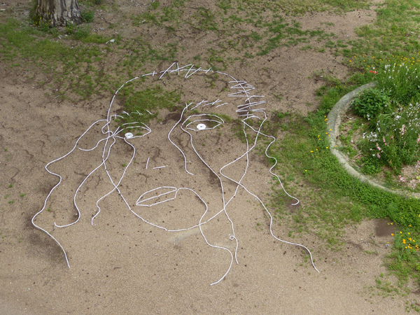 Echoing the 100 plaques, a face is sewn into the ground, Memorial In situ (or street art), below.