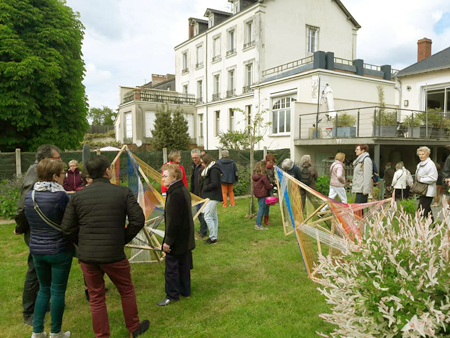 An element in light and transparent wood structure landed, stranded on the Garden of the Cure and the Garden of the Peltrie du Mesnil en Vallée.
