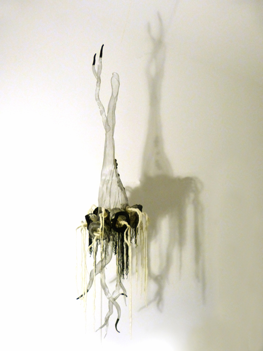 Module 03 - composant rhizomique Installation/volume Fil d’aluminium et moustiquaire en aluminium, coton, laine H150 D50 cm , 6 petits modules sont placés autour (non présentés ici) 2014