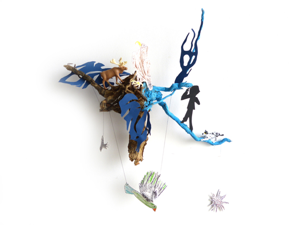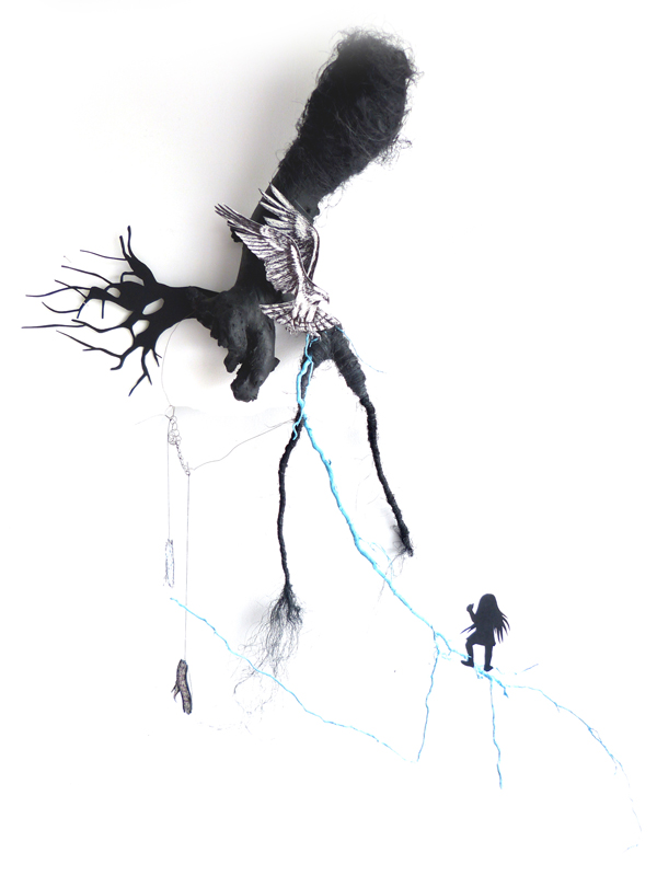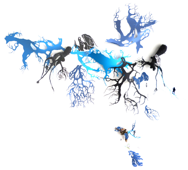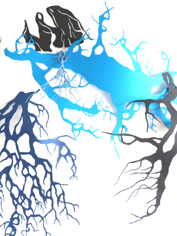 Le réseau se constitue en papier découpé noir mais la couleur intervient en bleue, signe pour moi de l’espoir et de la vie. Le papier est