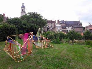 Un élément en structure de bois léger et transparent s’est posé, échoué sur le Jardin de la Cure et au Jardin de la Peltrie du Mesnil en Vallée.