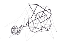 Des fils noirs traversent la structure de bois, ils s’entremêlent, se projettent et s’accrochent en point de perspective pour s’implanter au sol.